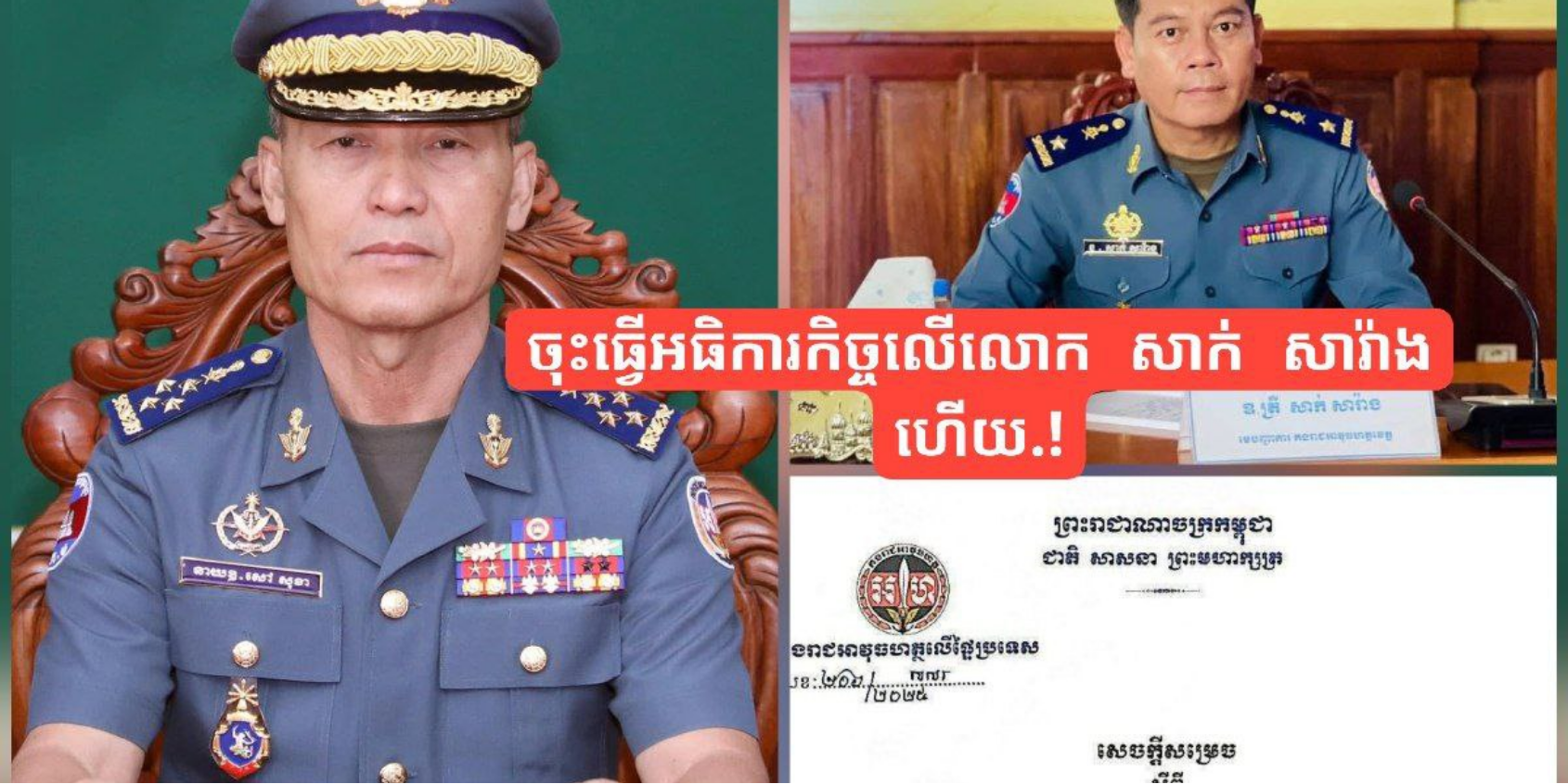 (ភ្នំពេញ)៖ នាយឧត្តមសេនីយ៍ សៅ សុខា អគ្គមេបញ្ជាការរង នៃកងយោធពលខេមរភូមិន្ទ មេបញ្ជាការ កងរាជអាវុធហត្ថលើផ្ទៃប្រទេស បានចេញសេចក្តីសម្រេចស្តីពីការបង្កើតក្រុមការងារចំពោះកិច្ច ដើម្បីធ្វើអធិការកិច្ច និងត្រួតពិនិត្យនូវសកម្មភាពមិនប្រក្រតី នៃការប្រតិបត្តិតួនាទី-ភារកិច្ច របស់ មេបញ្ជាការកងរាជអាវុធហត្ថខេត្តក្រចេះ។